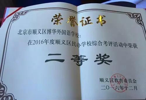 北京市順義區博華外國語學校榮獲2016年度順義區民辦學校綜合考評二等獎!!!