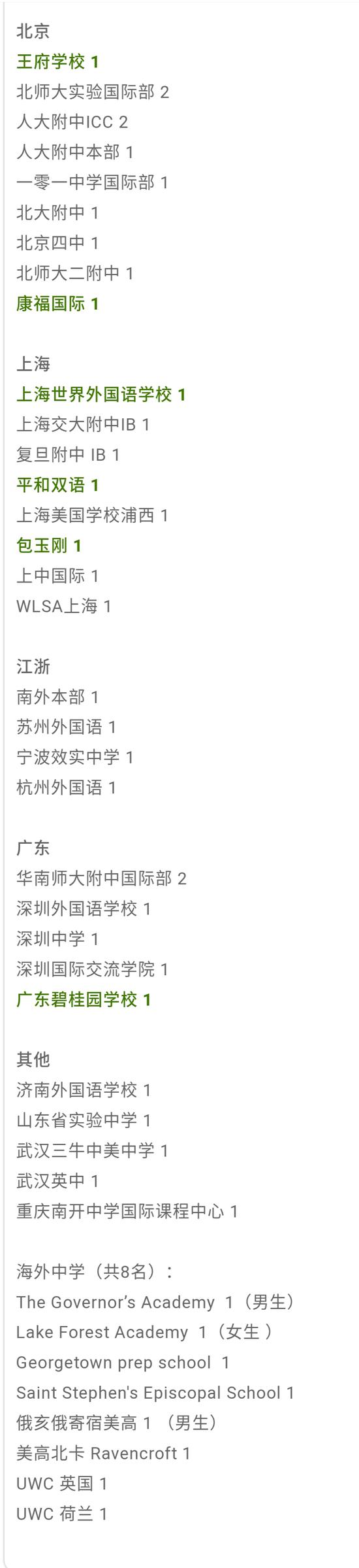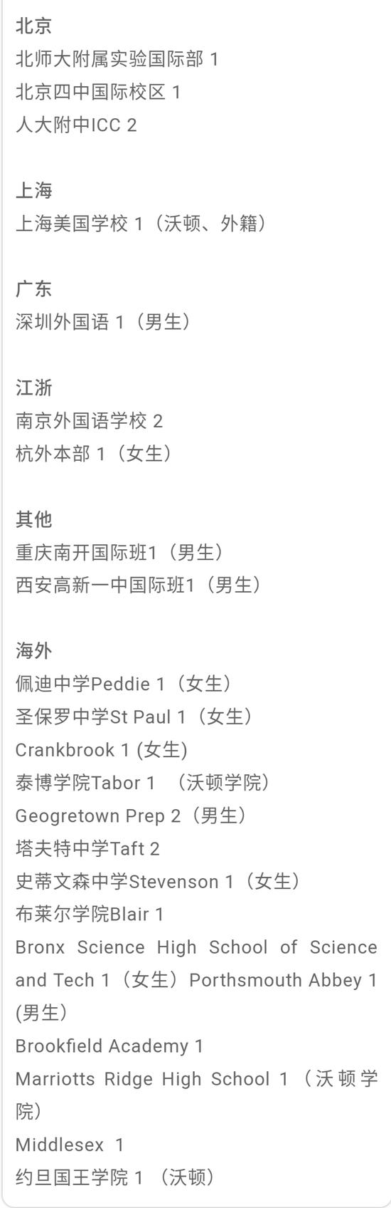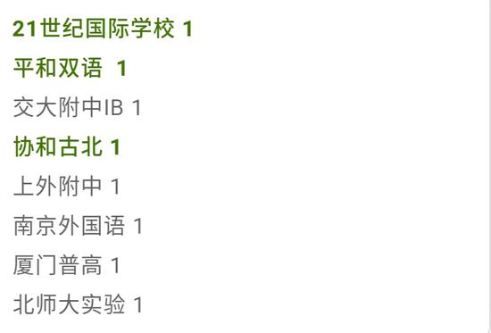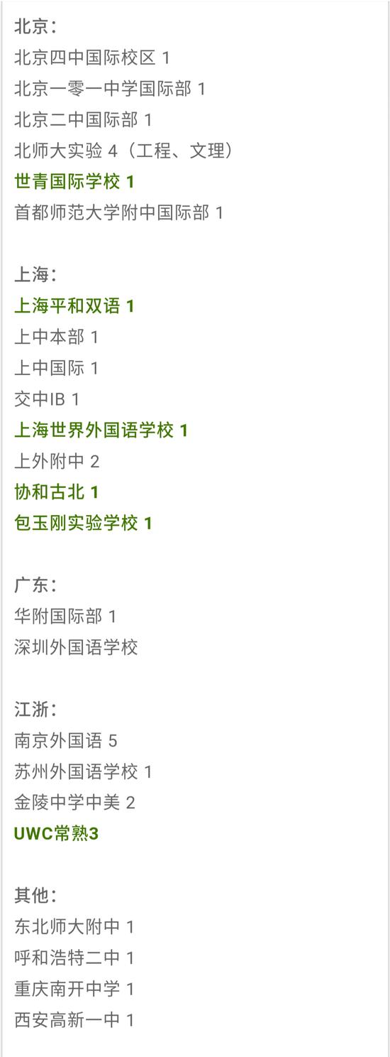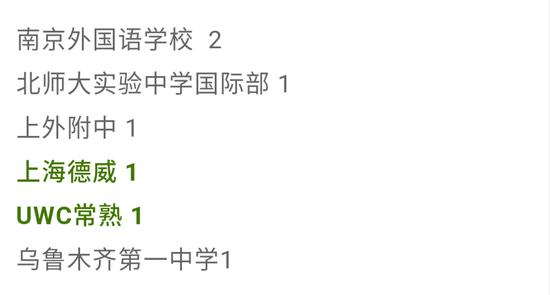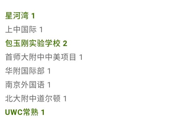 除此之外,與往年北京國際學校缺位的情況不同,今年除兩年連續收到康奈爾offer的世青,二十一世紀國際學校、王府學校等都拿到了包括達特茅斯學院學院與芝加哥大學在內的多所美國高校offer,勢頭強勁。