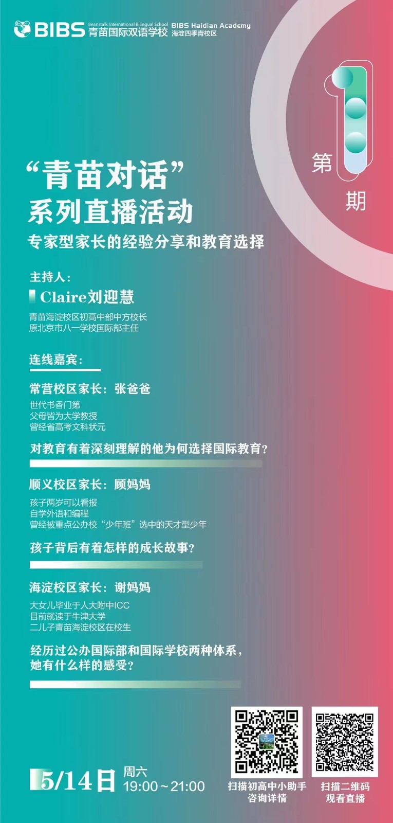 青苗國際雙語學校是北京學生家長們非常關注的一所國際學校,學校可以為3~18歲學生提供幼兒園到高中的一貫制教育。現在正值家長們選擇教育和擇校的關鍵時間點,對于擇校和孩子未來教育迷茫,或者想要了解被美國常春藤名校錄取的學生教育經歷的,可以關注青苗國際雙語學校近期將會開展的線上直播會議,會議內容,直播時間見下圖: