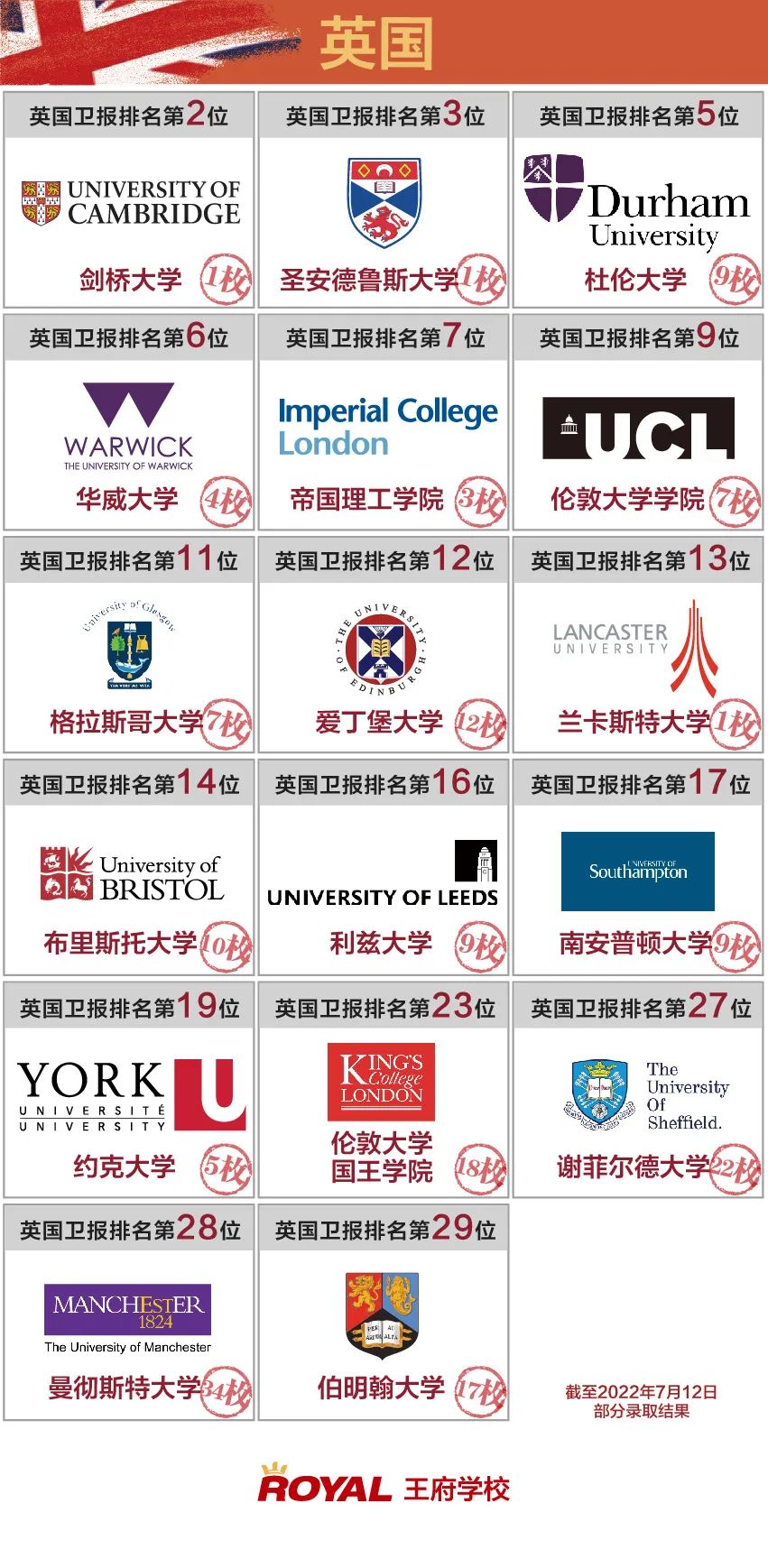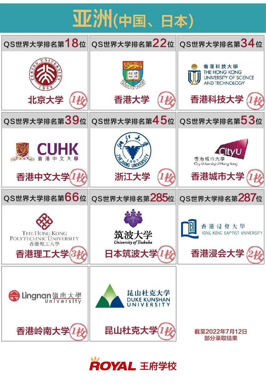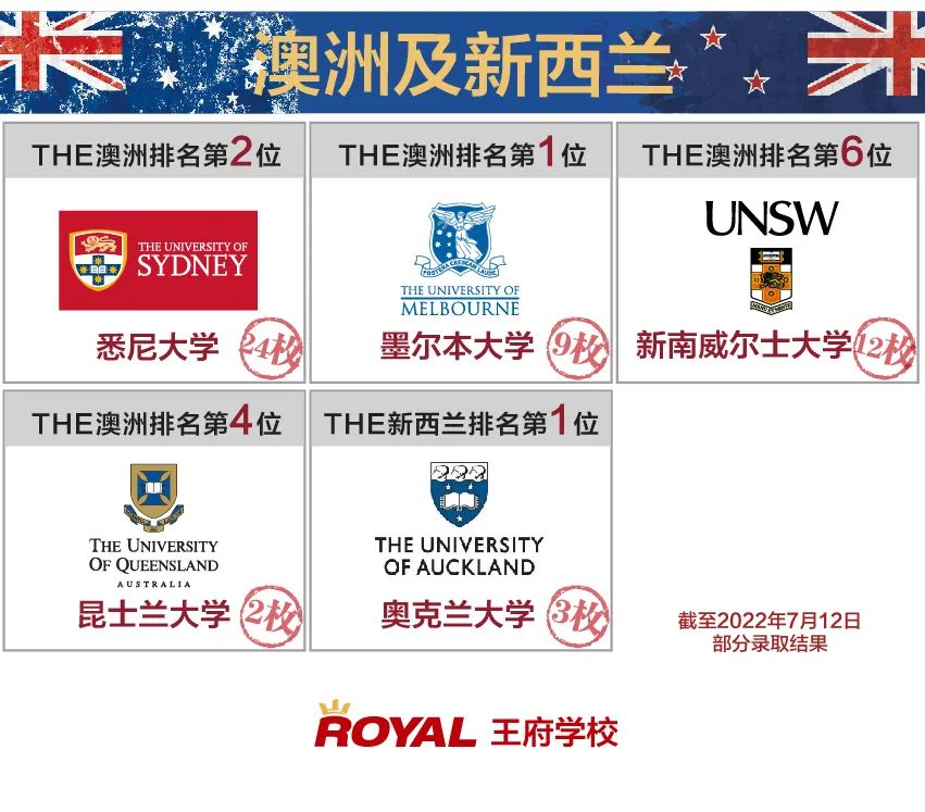 在英國方向,王府學子繼牛津大學后,再次敲開了劍橋大學的大門,錄取結果不僅覆蓋了帝國理工、倫敦大學學院等G5類院校的錄取,還收到了華威大學、愛丁堡大學等老牌名校的青睞。