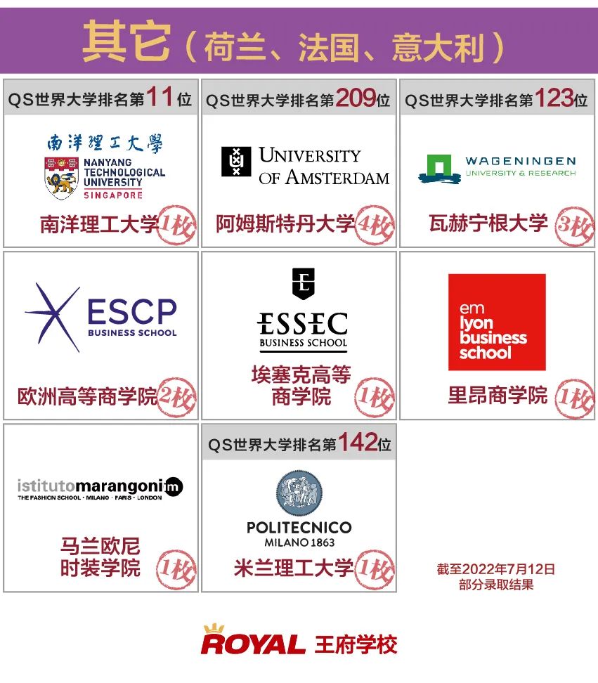 在王牌專業錄取上,王府學子收獲了3枚傳媒專業世界排名靠前的荷蘭阿姆斯特丹大學的錄取,以及2枚創業學常年排名世界前三的美國巴布森學院的錄取,強悍的專業實力再獲印證。