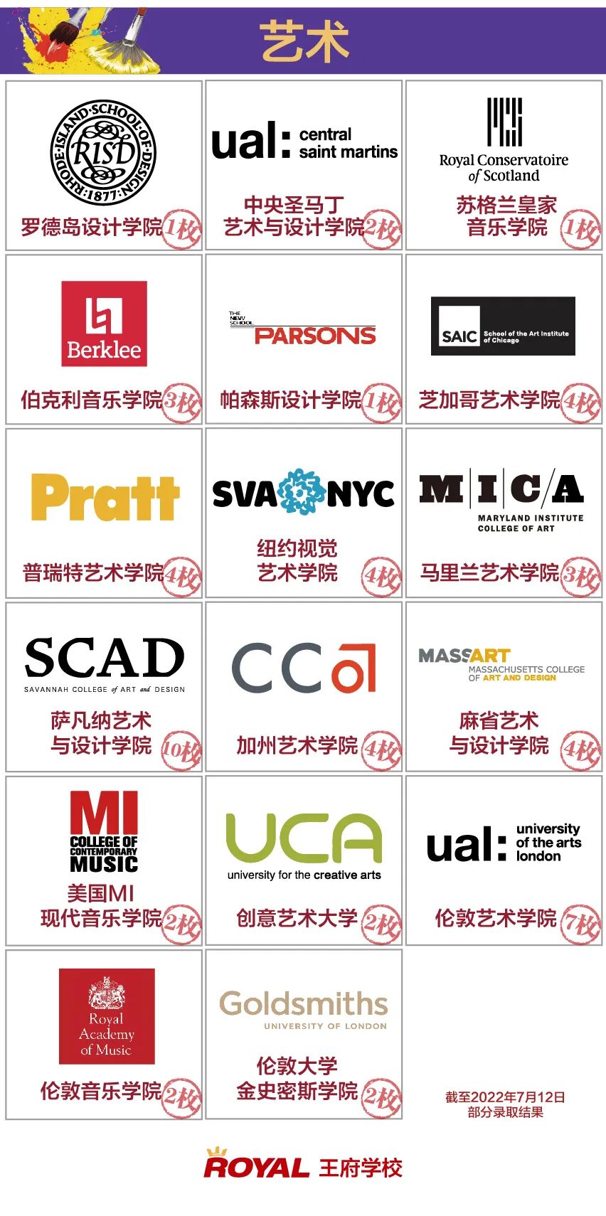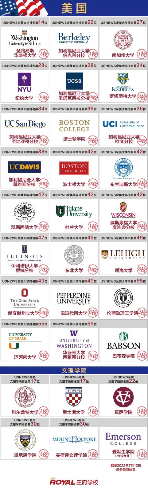 在美國方向,王府學子已斬獲圣路易斯華盛頓大學、加州大學伯克利分校、南加州大學等名校錄取,不僅連續獲得紐約大學的錄取,今年更是再創新高,收獲16枚紐約大學多個專業的錄取,錄取數量躋身北京前三。藝術類名校錄取更是收獲頗豐,不僅收獲了伯克利音樂學院、羅德島設計學院的錄取,還收獲了中央圣馬丁等知名藝術大學的錄取。美國TOP30名校錄取比率高達27.2%,美國TOP50學校錄取率56.7%,美國TOP100學校錄取率100%。