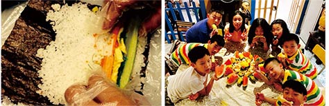 DIY美味壽司:一起來學做壽司吧,自己弄的味道更佳哦!準備食材、鋪飯、加餡料、裹卷、封口、切片(分工合作),學會回去弄給最愛的爸媽嘗嘗。