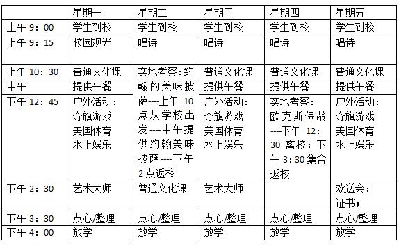 備注:所有的課程內容將按照美國學校當天的教學計劃來進行,以上課程僅供參考。若遇上美國學校的考試周或者公共假日,將根據實際情況做相應調整。