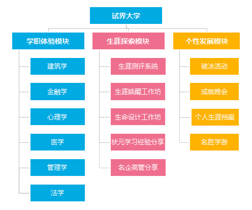 三大模塊:學職體驗模塊(Major Experience Module)、生涯探索模塊(Career Exploration Module)、個性發(fā)展模塊(Personality Development Module)。
