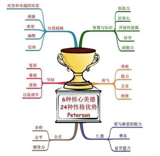 Peterson領導的課題組梳理了幾乎所有人類重要的文化典籍,從圣經、古蘭經、道德經這樣的宗教典籍,到哈利波特這樣的流行小說,想從中整理出具有普世價值的、能被所有文化和時代承認的、又彼此獨立的性格優勢,于是6種核心美德和24種性格優勢誕生啦。這些美德和性格優勢是一個人獲得幸福的非常重要的積極心理力量。