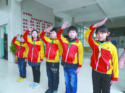 下午4點30分,武漢市光谷六小校門口,看到五名學生佩戴著綠領(lǐng)巾,一邊敬隊禮,一邊齊聲提醒“各位同學,請按時平安回家,路上注意安全!”