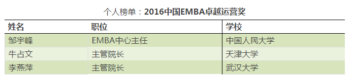 繼去年底躋身“中國EMBA排行榜”全國五強后,近日,中國人民大學商學院EMBA又傳來捷報。在剛剛發布的《中國價值25EMBA》中,中國人民大學商學院脫穎而出,與清華、北大和長江一同入選競爭最為激烈的北京地區榜單四強之一。在個人榜單上,EMBA中心主任鄒宇峰博士被授予2016中國EMBA運營獎,成為一位獲該獎項的非院長職務的管理者。