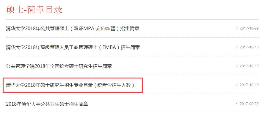 進入“清華大學研究生招生網”官網,點擊“碩士招生”進入頁面后,點擊“簡章目錄”,查看當年研究生招生專業目錄,即可查看清華大學非全日制研究生招生專業,如圖所示: